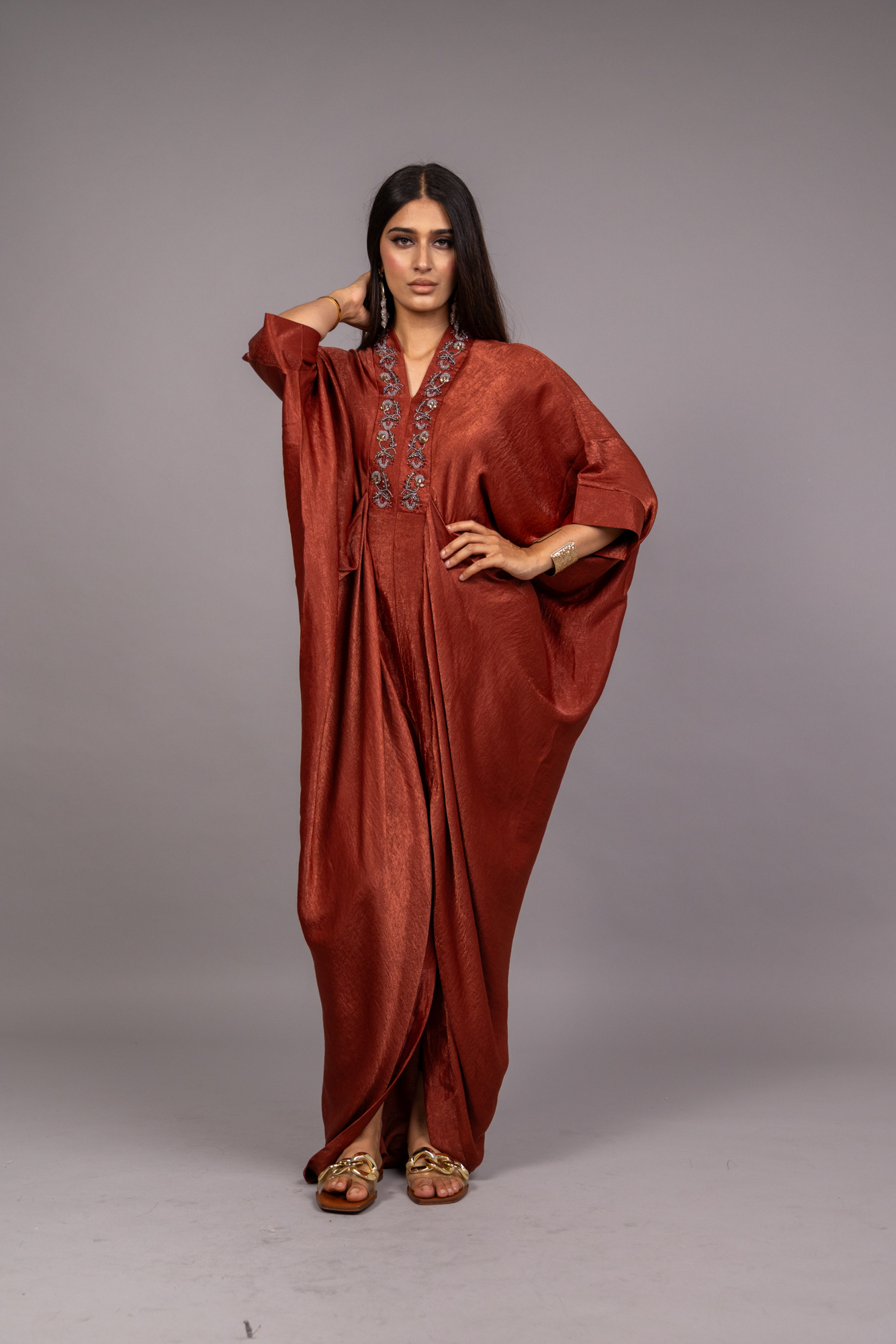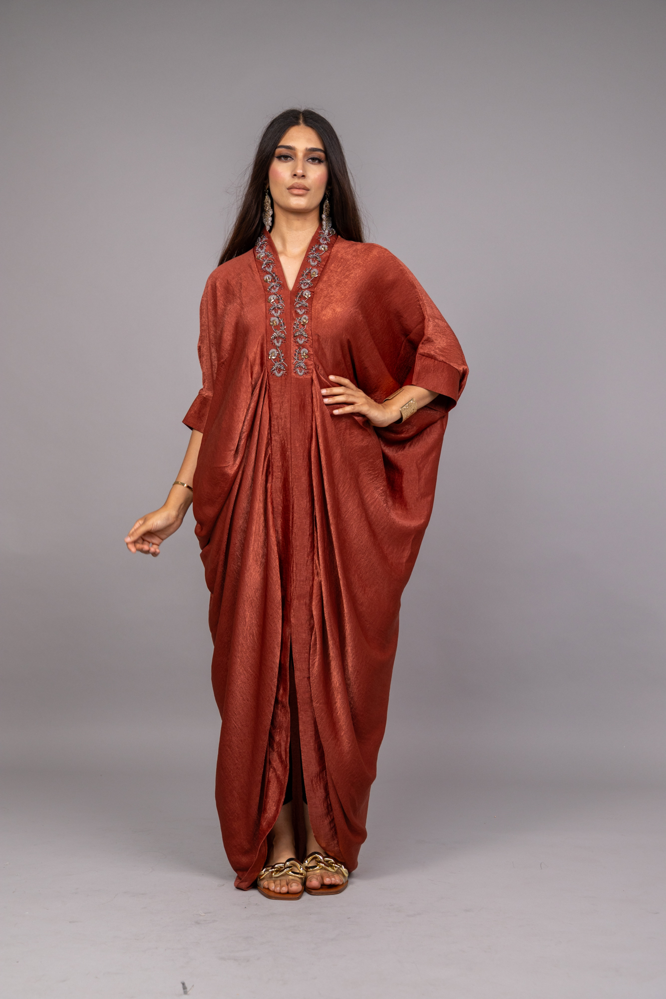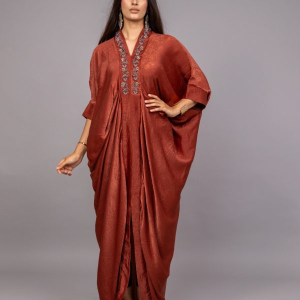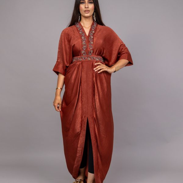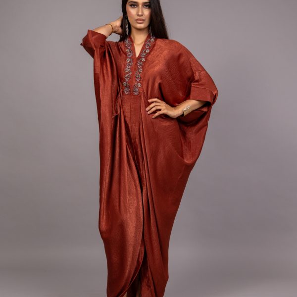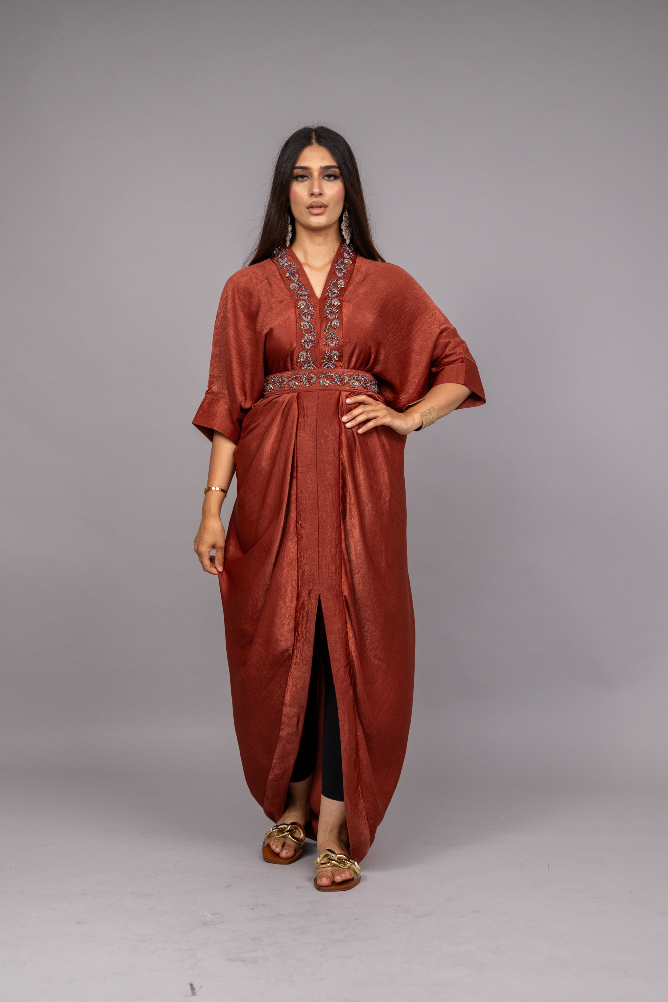 Dresses to keep you stylish and sassy! This free size kaftan adorned with heavy neck embroidery and embellished belt! Free size and perfect for any occasion