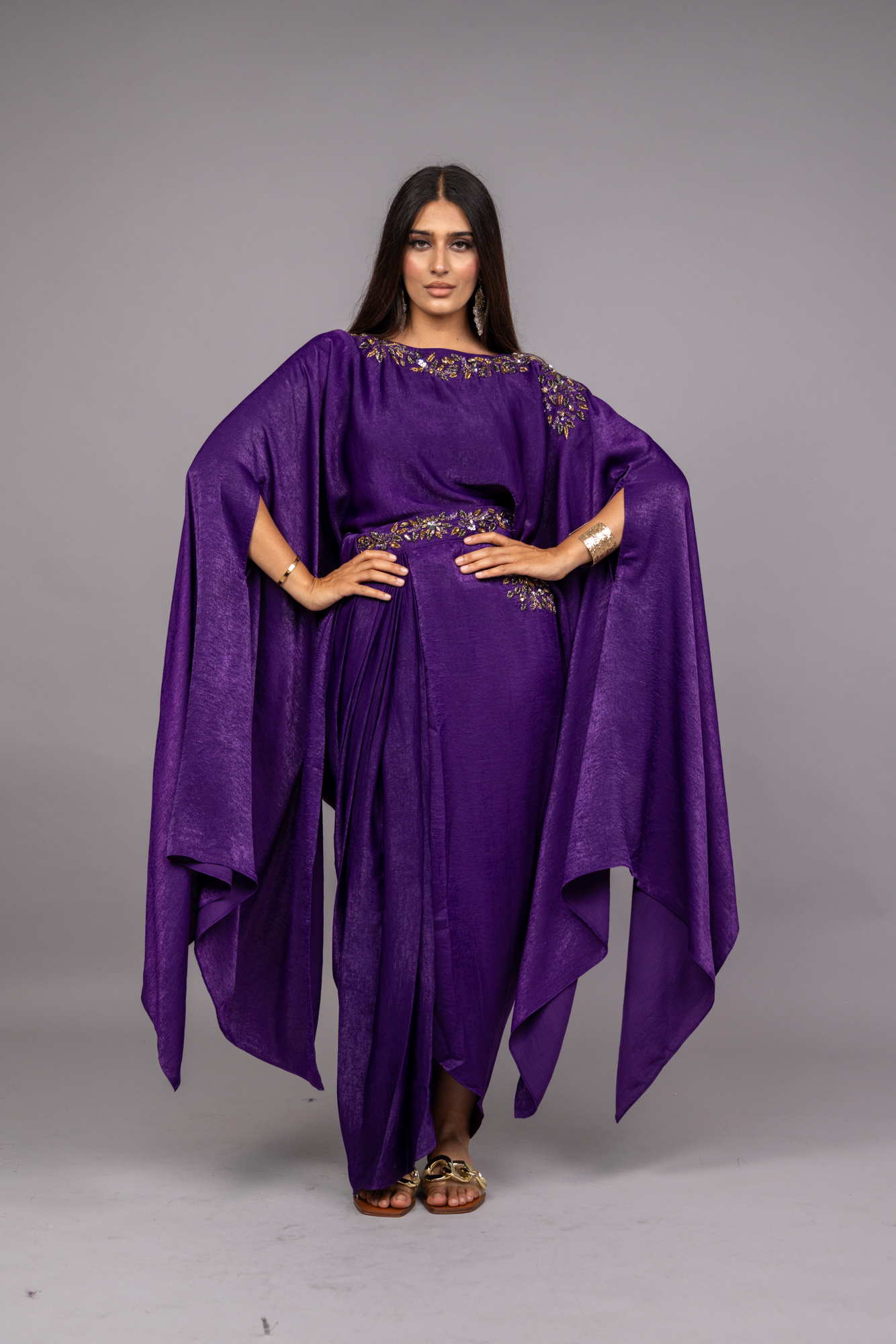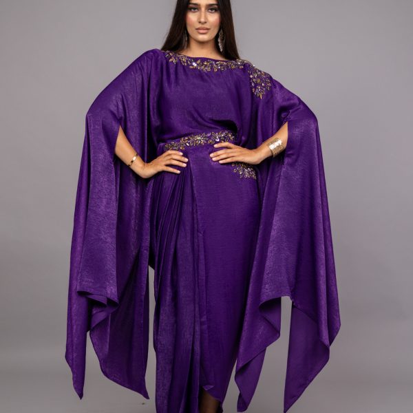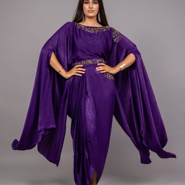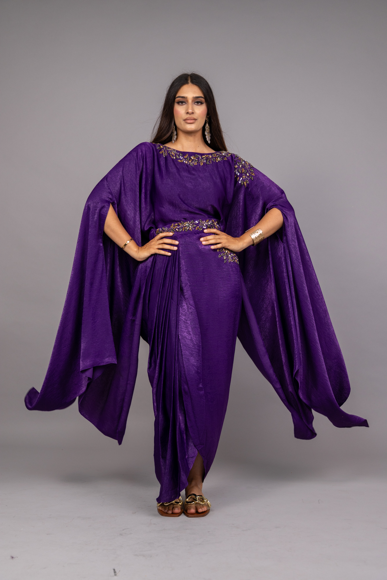 Transport yourself to a world of sophistication. Belt and elastic skirt with embroidery and cape with heavy embellishment on the neck.