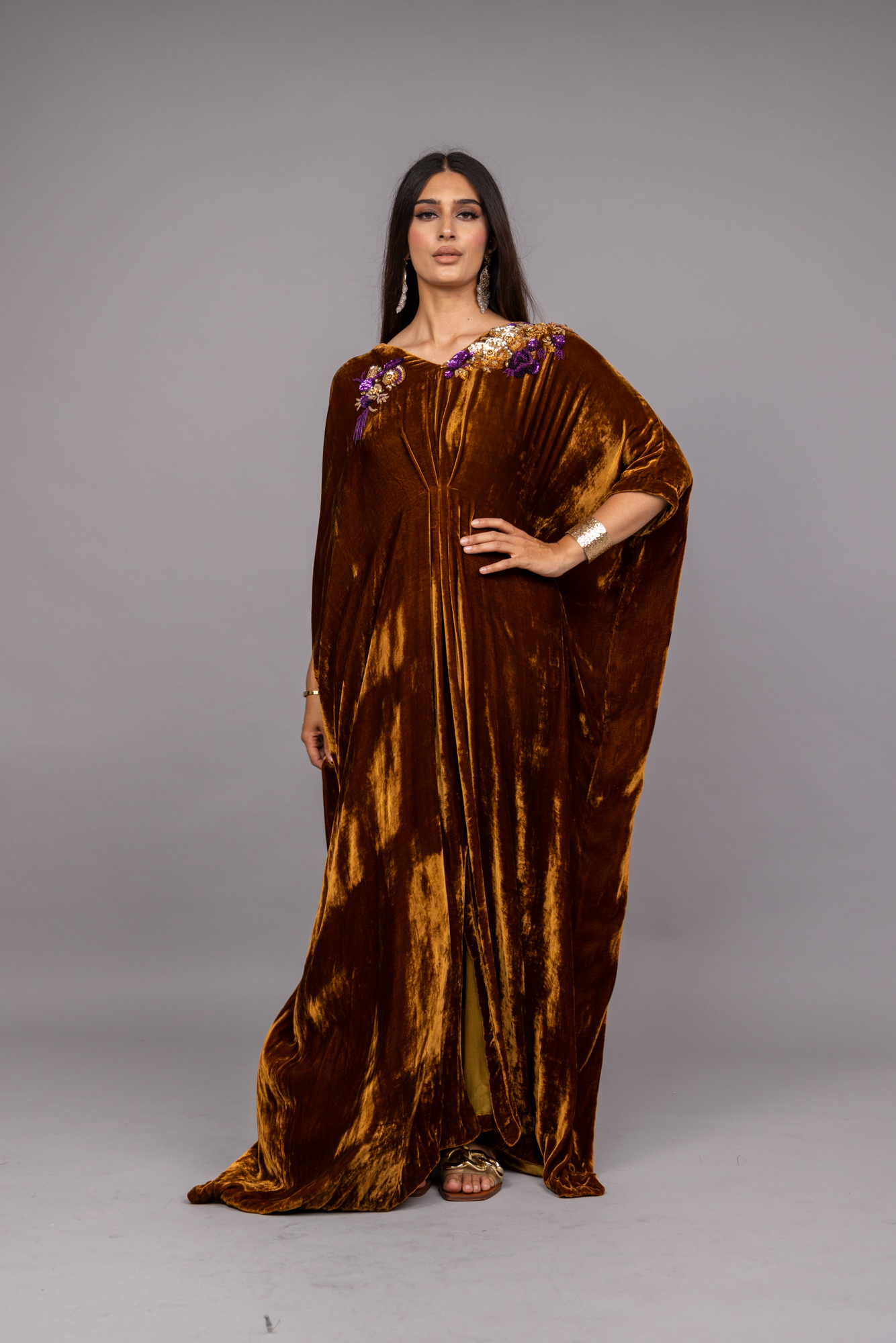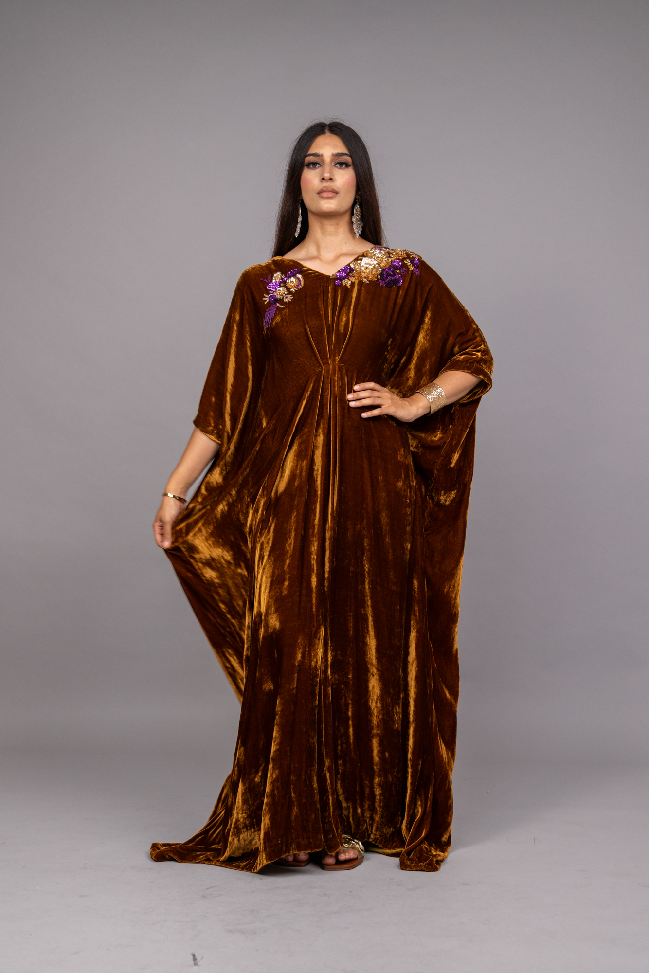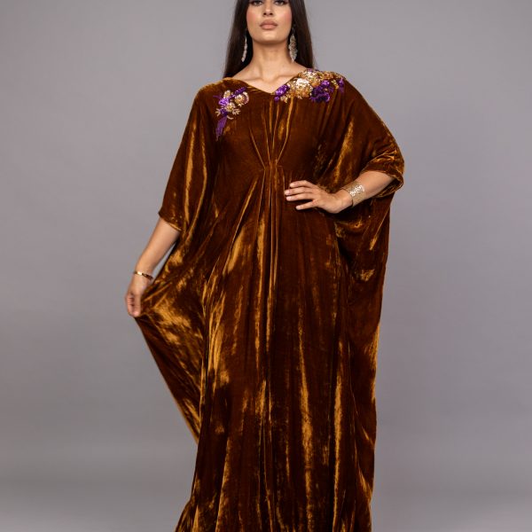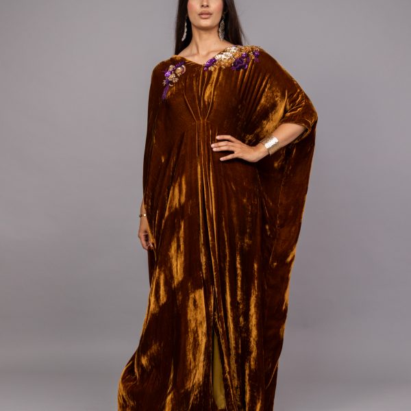 Dazzle in our velvet kaftan, free size fit for any occasion! With sequin embroidery on neck