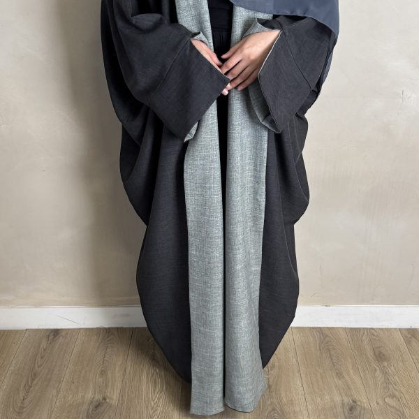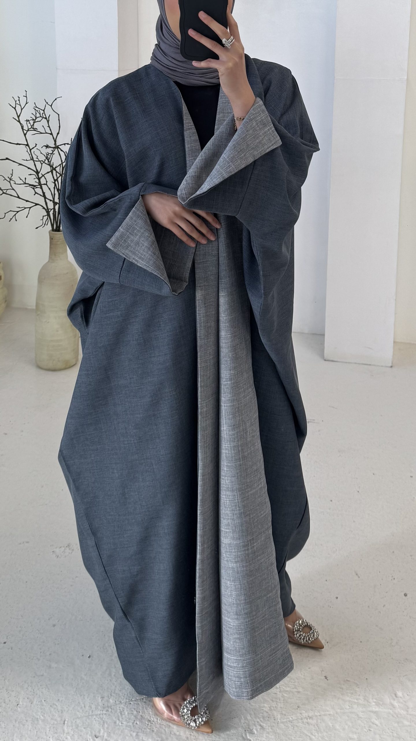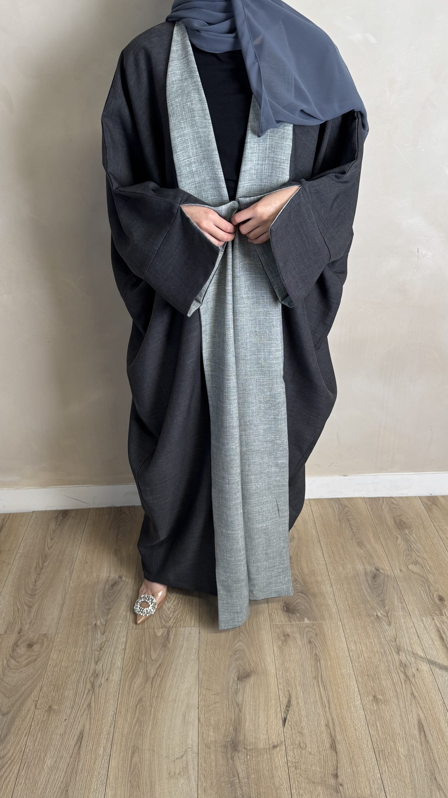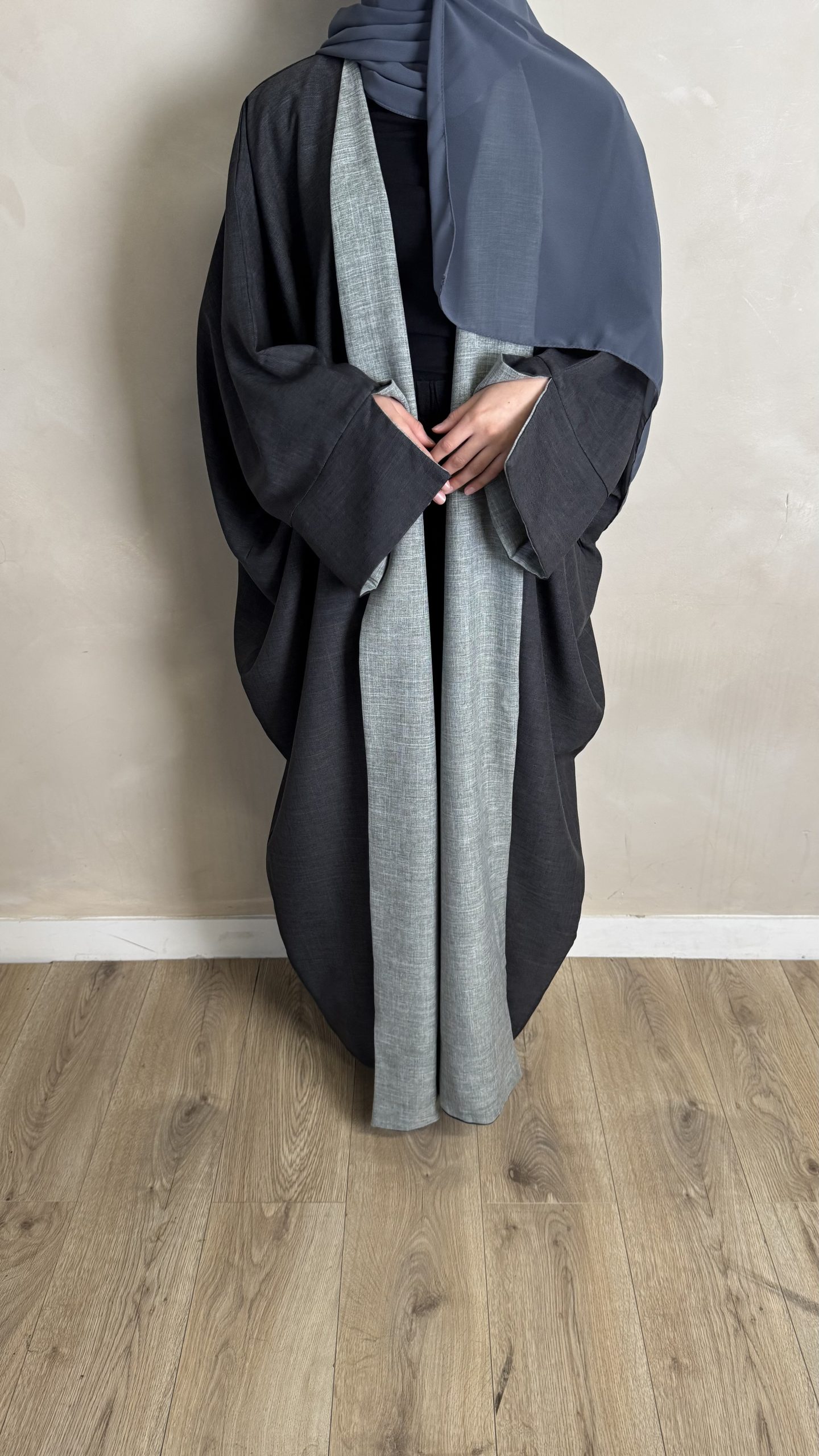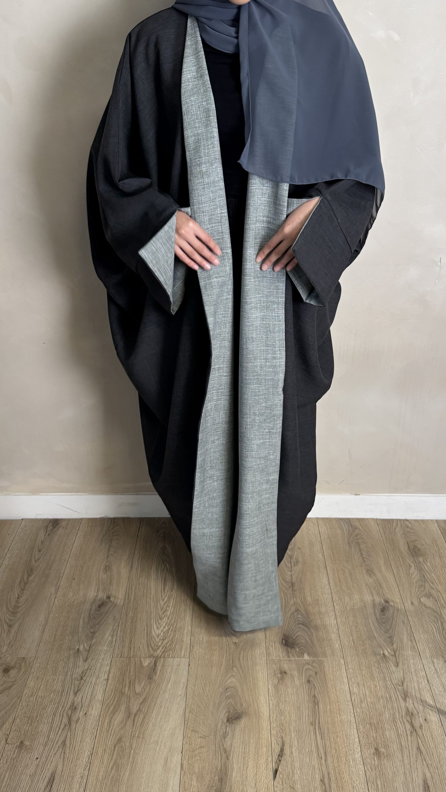 A striking two-tone abaya designed to be fully reversible, giving you two looks in one. Its elegant batwing silhouette and flowy drape offer effortless movement, while the split-sleeve detail adds a chic, contemporary touch.