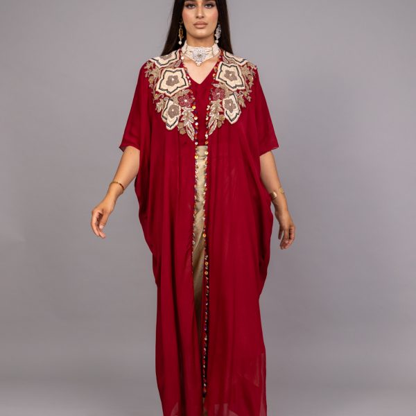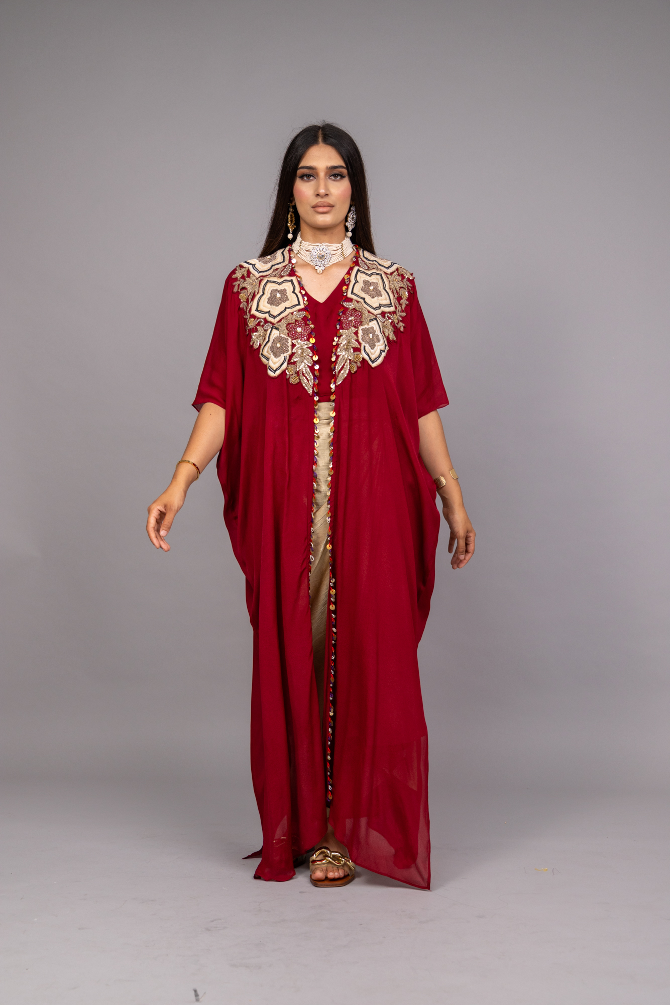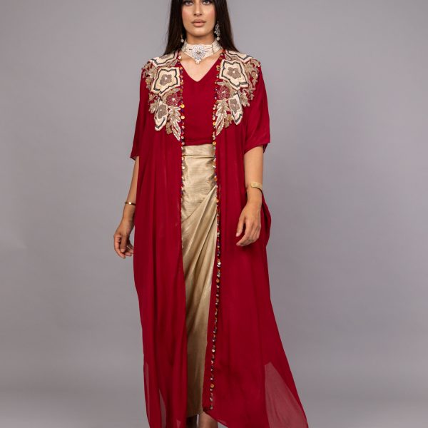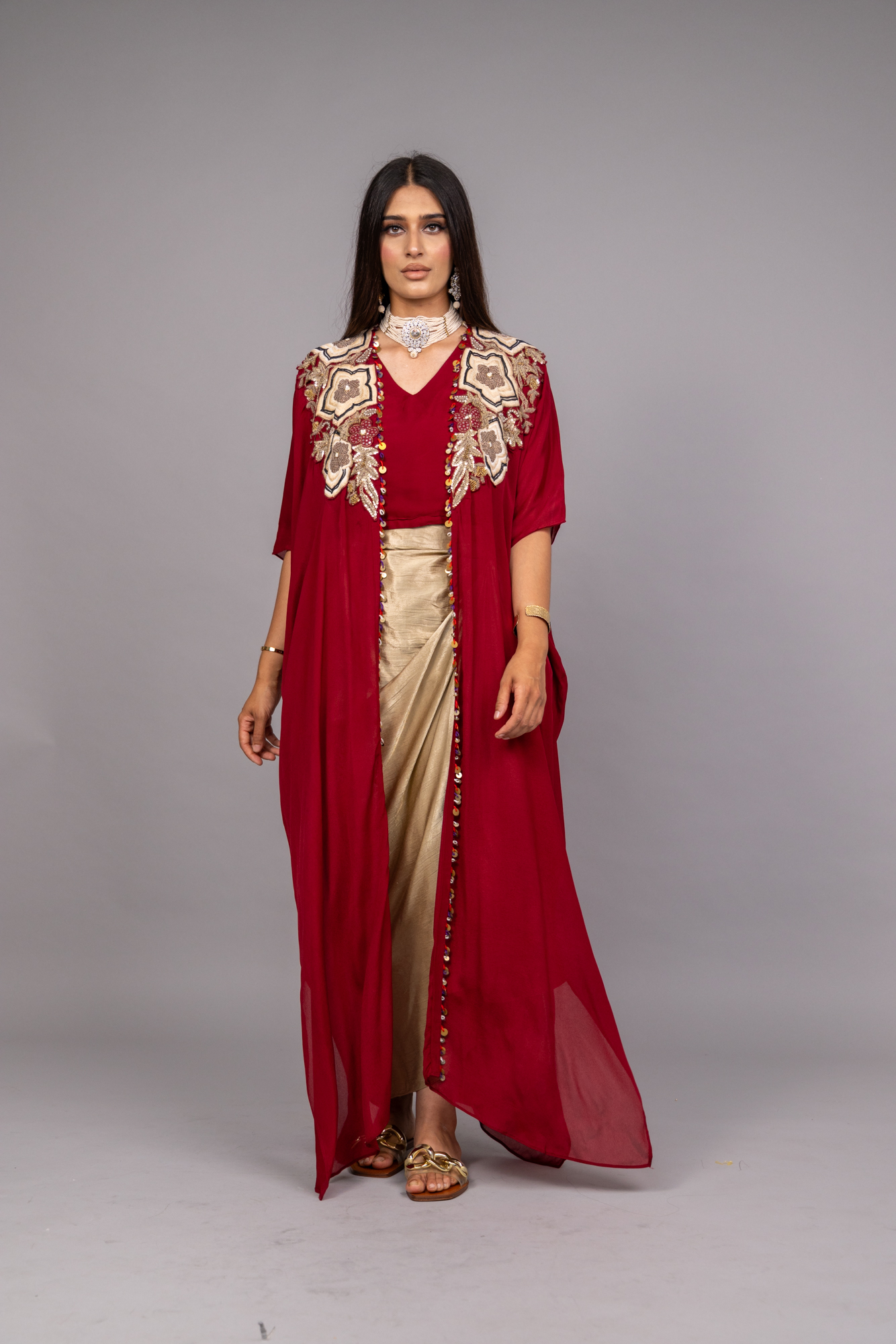 Transport yourself to a world of sophistication with this 3 piece set! Drape skirt with heavy embroidered neck jacket. Would fit from a size 8-16