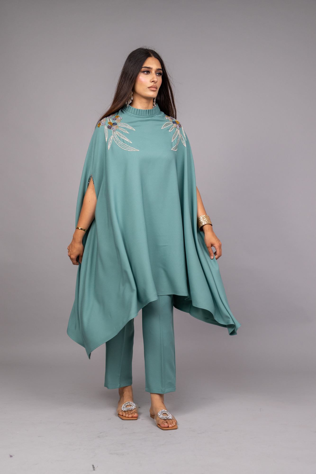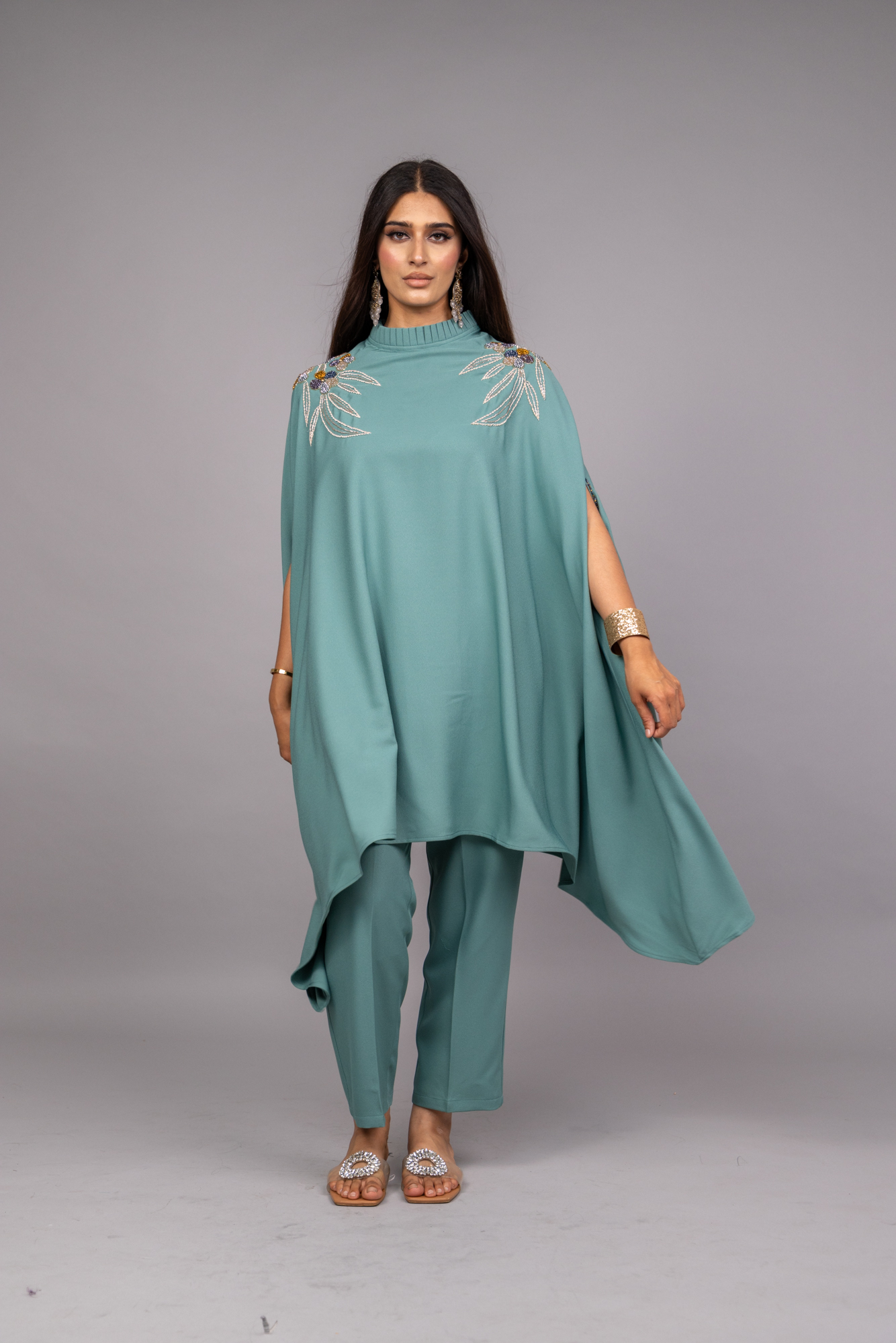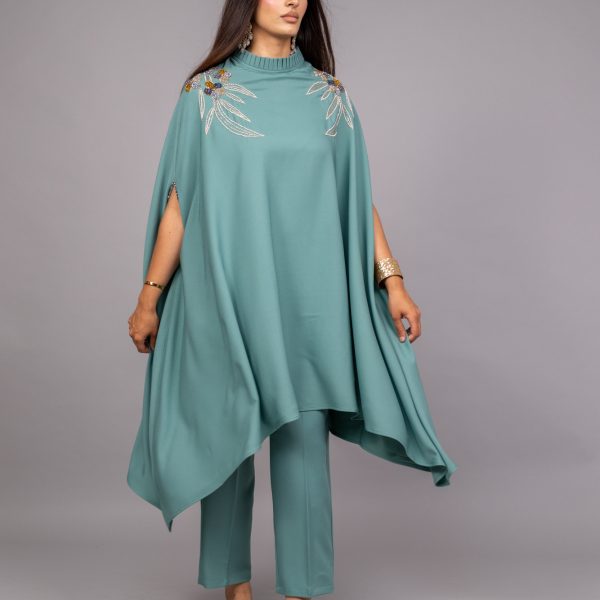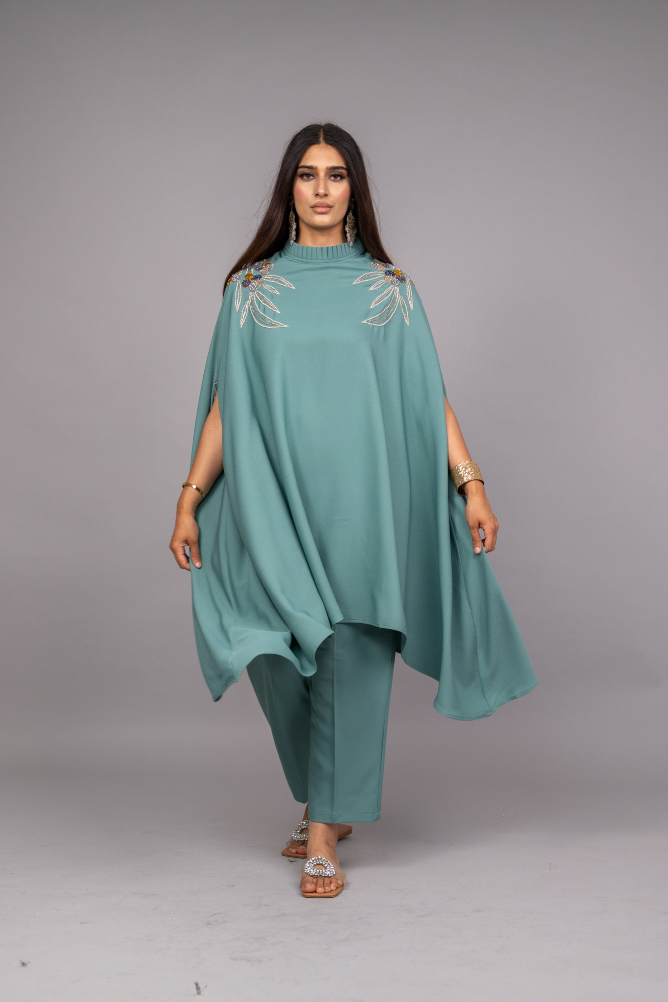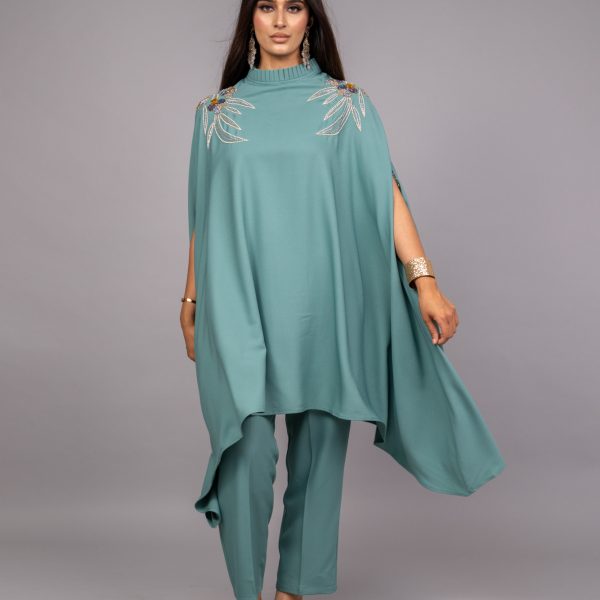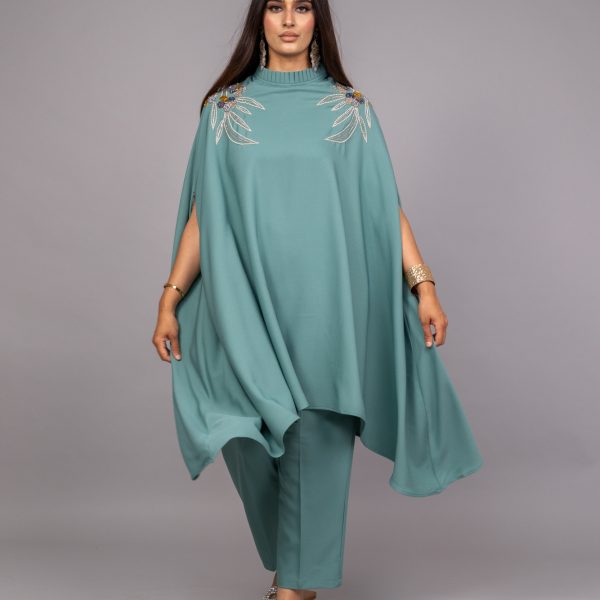 Our exquisite cape design with shoulder embroidery is perfect for any occasion. Pleated neck detail, comes with a belt and elastic trouser