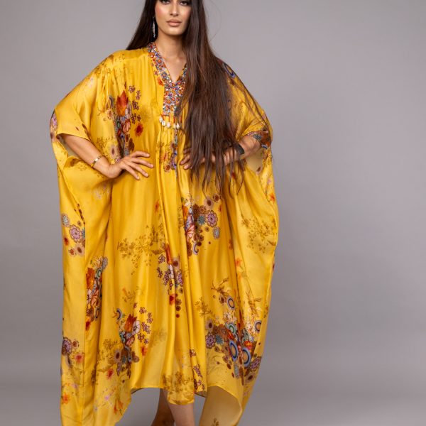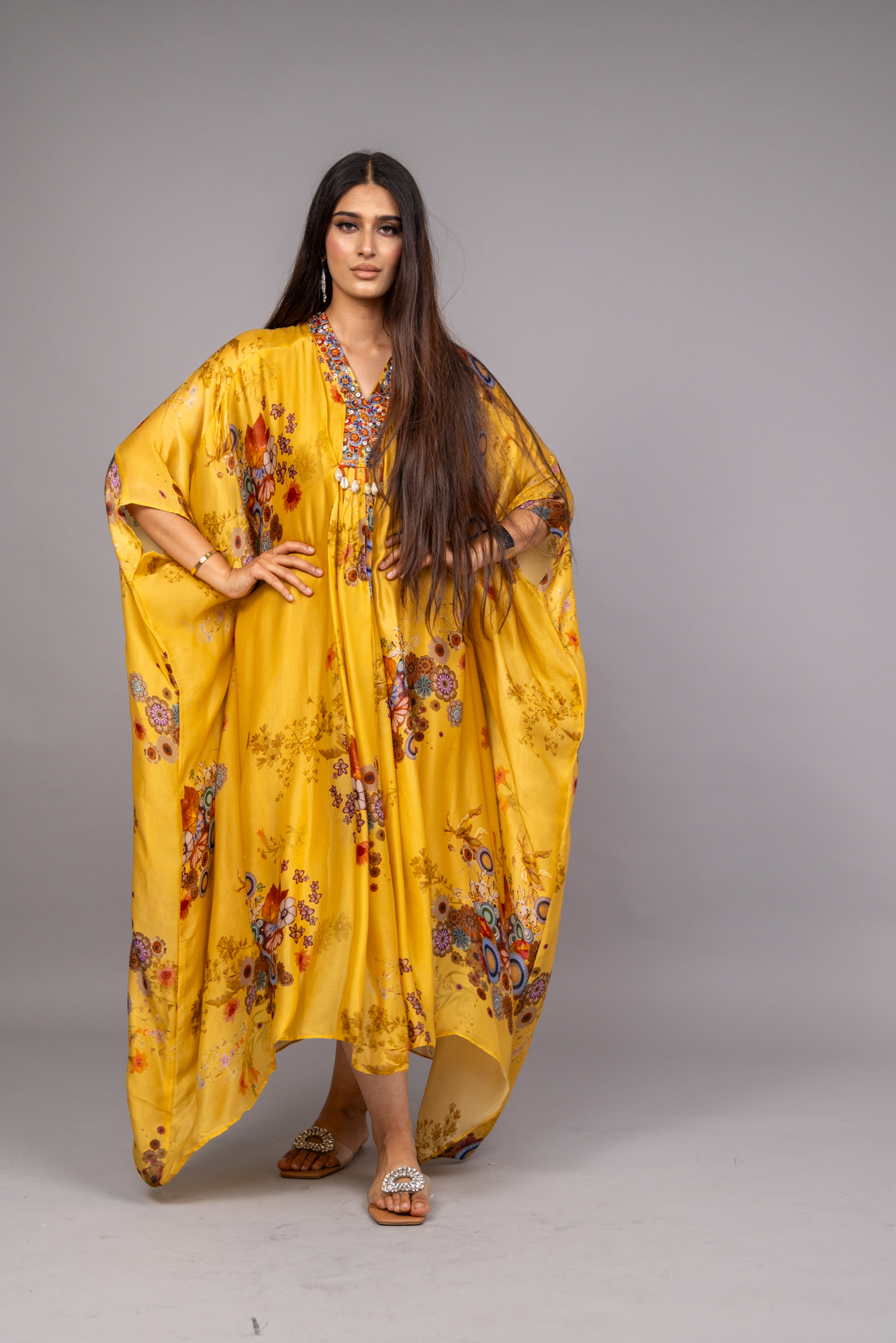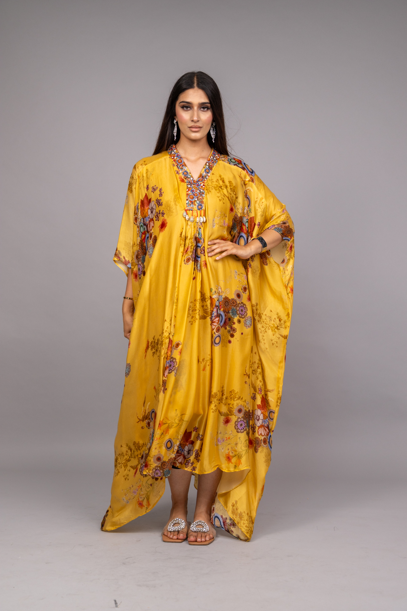 Indulge in luxury with this printed chiffon kaftan with heavy neck embroidery, free size!